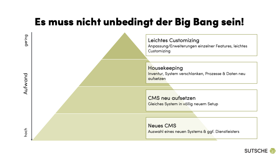 Ein fokussierter Ansatz, der sich nur auf das CMS selbst konzentriert. Hier können Verbesserungen auf Systemebene für mehr Effizienz und Stabilität sorgen. Die Maßnahmen innerhalb dieses Baukastens sind flexibel kombinierbar und reichen von kleinen Eingriffen bis zu größeren Umstrukturierungen: